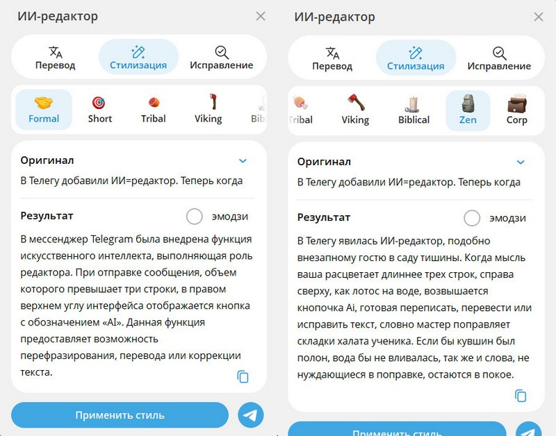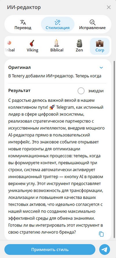В дом Телеги был введен новый наставник, именуемый ИИ-редактор, дабы слово человеческое не было блуждающим. И вот, когда речь ваша простиралась длиннее трех строк, являлась в углу верхнем десница, именуемая Ai, призванная переделать, перевести или исправить словеса ваши. Ибо написано: «Где много слов, там и беззаконие, но кто сдерживает уста свои, тот мудр». Таков же облик сей дивной вещи.