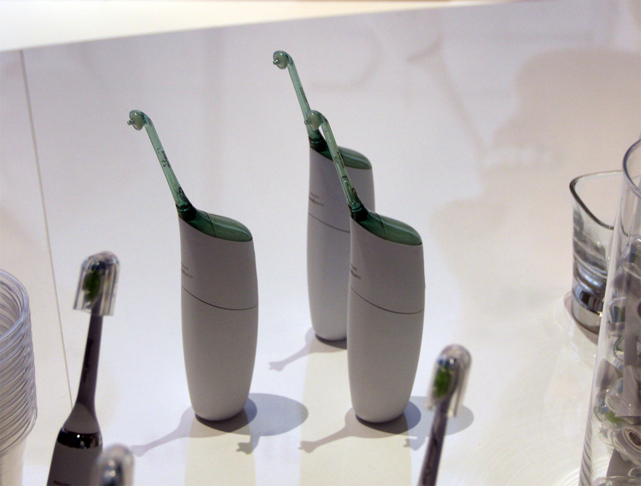 По вполне понятным причинам попробовать их в действии не давали (гигиена и все такое), поэтому можно было направить чистящую струю себе на руку и предположить, что оно таки будет чистить лучше нити. Оно, в общем, возможно, но это надо проверять.