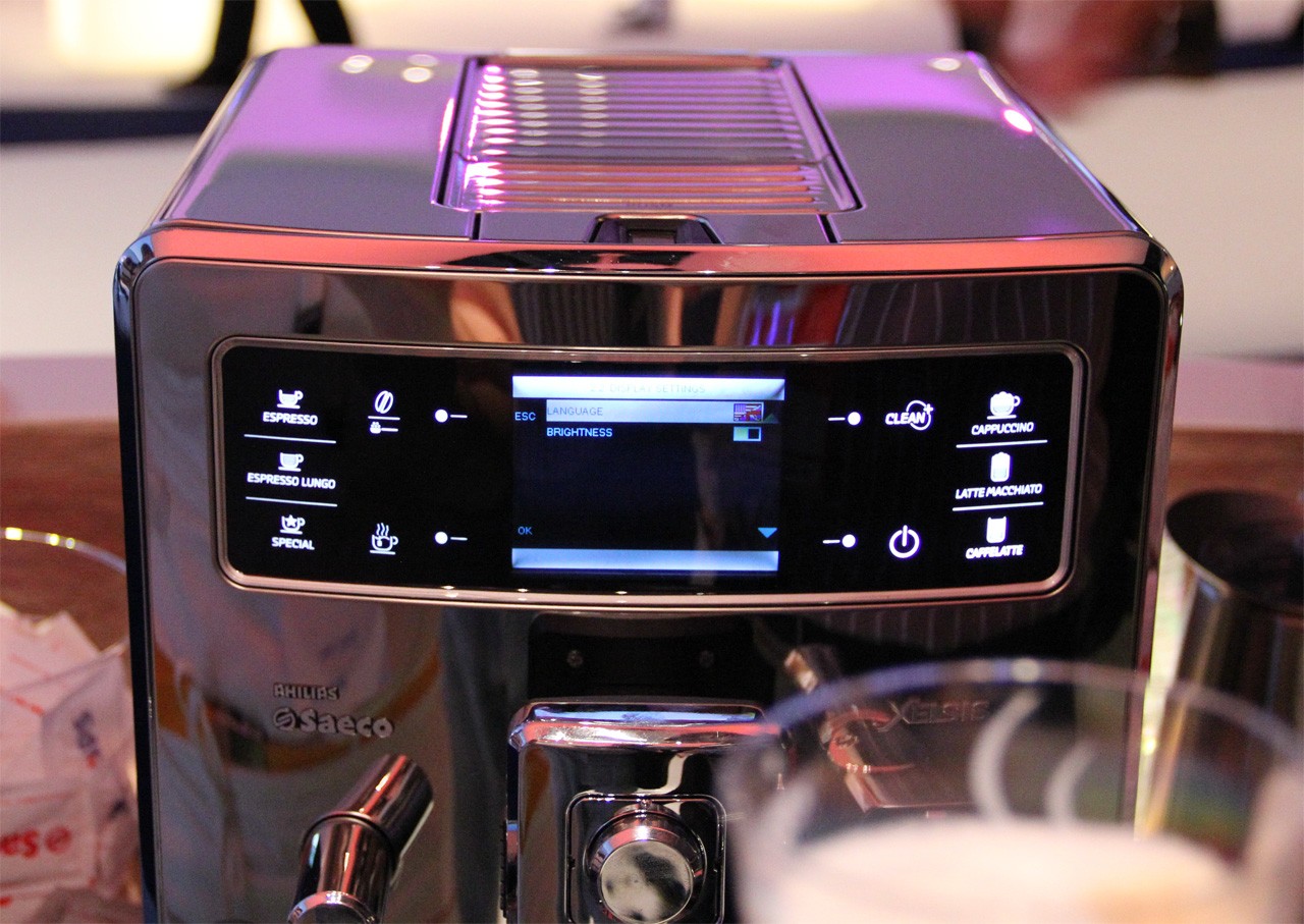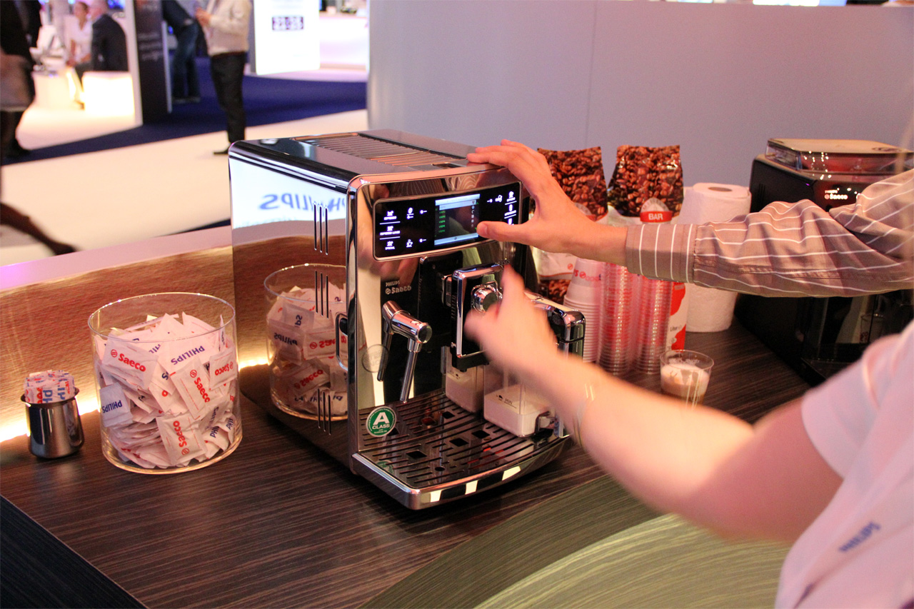Нам демонстрировали ее работу - очень здорово управляется с дисплея, кофе делает во всяких мыслимых и немыслимых вариантах, включая латте и каппучино.