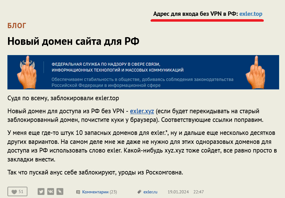 (чтоб два раза не вставать) для читателей: имеет смысл проверять доступность ранее заблокированных доменов, например, exler.ru, похоже, в России нынче доступен (выше уже указали на это)