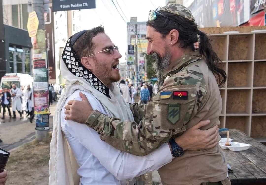 "2023-09-16 Умань, Украина, хасид паломник целует шеврон в виде красно-черного флага со звездой Давида на руке украинского воина из "Азова" с позывным Ребе, который приехал в Умань на праздник Рош-га-Шана на один день с передовой на восточном направлении (будни и праздники "укрнацистов")", - подписал опубликованное фото его автор.