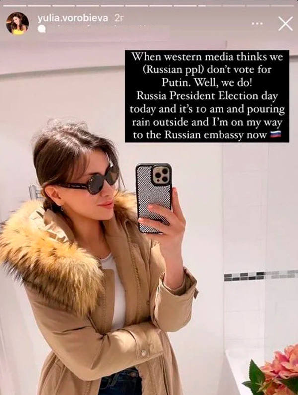 Некая Юлия Воробьева, работающая в Лондоне в компании EGRE, перед так называемыми "выборами" в РФ в своем Инстаграме (он сейчас закрыт от свободного доступа) гордо сообщила о том, что в день выборов с самого утра, несмотря на дождь, она побежала голосовать за Путина - российского диктатора, узурпатора и международного преступника, ордер на арест которого выдан Гаагским судом.