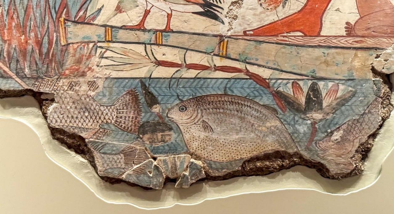 Фреска изображает Небамуна со своим любимым котом на охоте в зарослях папируса в царстве мёртвых. Вероятно, к этому времени кот уже умер, опередив своего хозяина, но тут он непревзойденный охотник, поймавший трех птиц. Обратите внимание, глаз кота на фреске был инкрустирован.