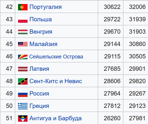 Между прочим, на 2018 год по данным МВФ этот показатель у России равен 29 267 долларов.Да, на 49 месте по миру. Сразу после нищей Греции. Но позади нищей Португалии и нищей Латвии.