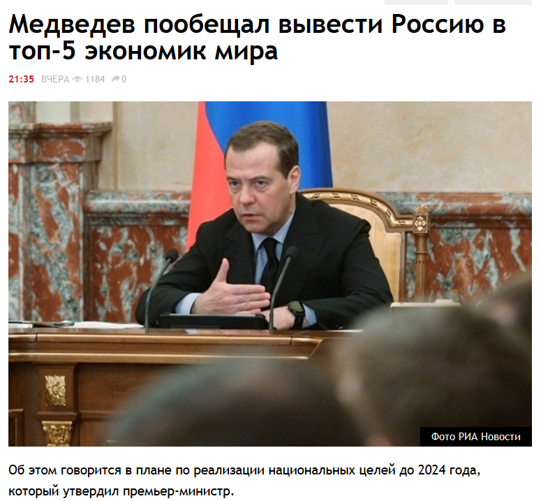 Медведев утвердил план вхождения РФ в пятерку крупнейших экономик мира в 2023 г.