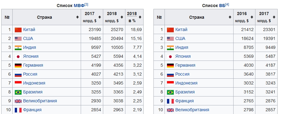 "В настоящее время Россия занимает 6-е место по объему ВВП по паритету покупательной способности (ППС) согласно оценке МВФ. В 2017 году отставание от Германии (которая занимает 5-е место) по данному показателю составило 4,4%, при этом ВВП России больше, чем ВВП Индонезии, занимающей 7-е место, на 19,1%", - говорится в едином плане. (Отсюда.)