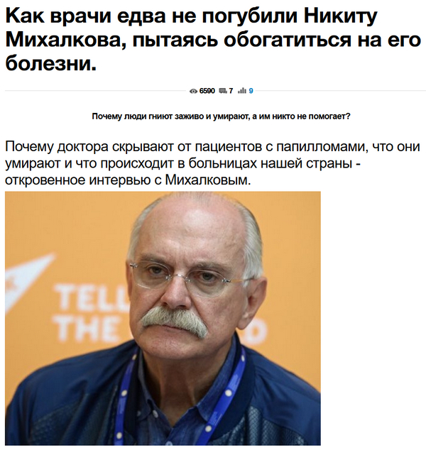 На самом деле это Михалков просто собирается судиться со всякими говносайтами, торгующими "таблетками от паразитов", "препаратами для детокса" и так далее, которые любят себя рекламировать якобы отзывами от всяких известных личностей. Там постоянно мелькают Пугачева, Безруков, тот же Михалков и так далее.