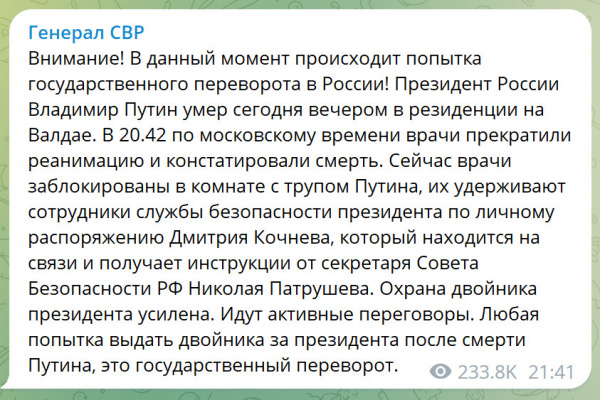 Не абы какого, а самого Путина. Генерал СВР убил. Впрочем, пока "Лебединого озера" по телику нет - я считаю, нещитово. Вот когда будет "Лебединое озеро" - тогда появится шанс.
