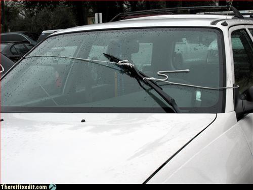 У меня как-то в дороге отвалилась тяга дворника - точно не помню, но конструкция типа эксцентрик на моторчике, от него тяги к дворникам, к приводу самого дворника тяга крепится чем-то вроде стопорного колечка, которое то ли потерялось, то ли разрушилось. Шёл дождь, плюс к этому - грязь от проезжающих авто. Ехать невозможно. Посмотрел на проблему, почесал репу, прошёлся вдоль обочины, нашёл подходящую проволочку, подвязал ей тягу с достаточной степенью свободы - вуаля, несколько лет уже эта проволочка работает.