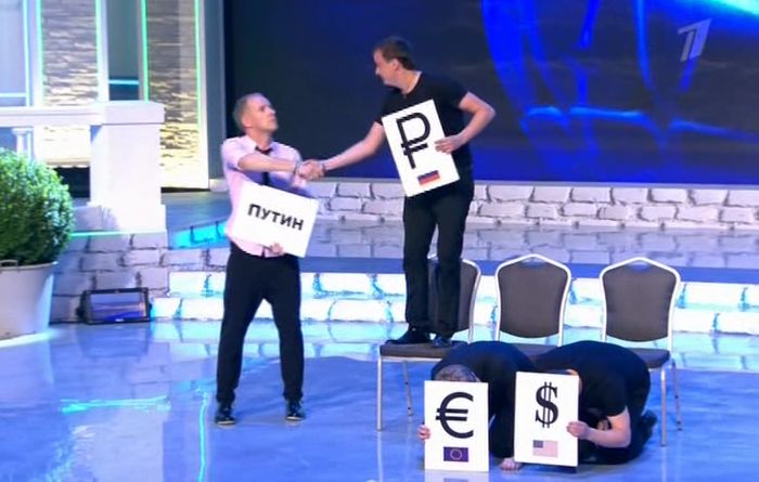 Смотрел вчера, чуть не стошнило. В этой сценке сначала евро, рубль и доллар сидят на стульях. Потом евро и доллар становятся на стулья, а рублю приказывают встать на колени на полу. Рубль бежит за кулисы и приводит "помощь" - Путина. Тот грозным жестом отправляет евро и доллар встать на колени, а рубль ставит на стул. Ура! Все апплодирут....