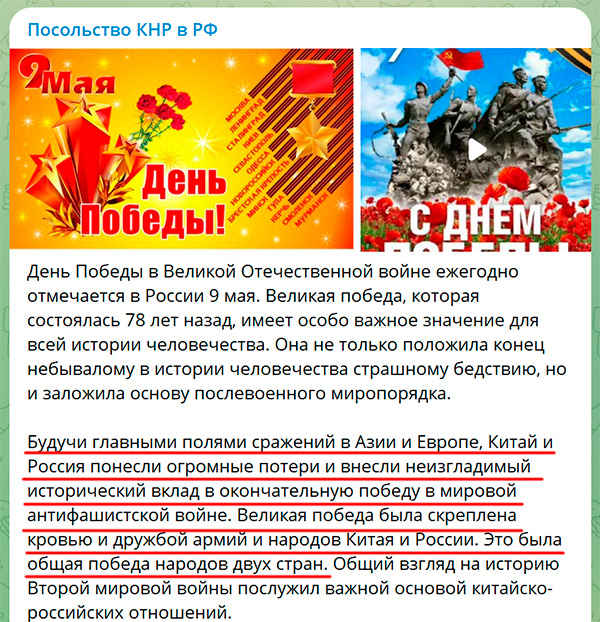 Запись в телеграм-канале посольства КНР в РФ. Насколько канал официальный - не знаю. Но сведения интересные, и я бы даже сказал - несколько неожиданные. А вы знали, что фашизм победили Китай и Россия (которой, кстати, тогда и не существовало вовсе)?