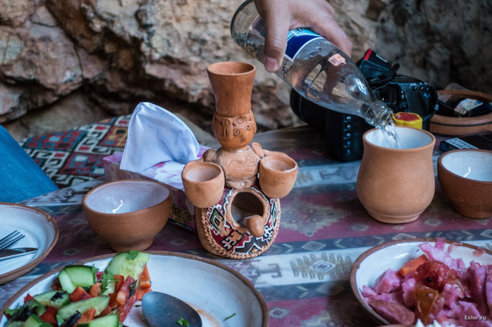 Принесли вино - вот уже настоящий стол! Вино домашнее, простенькое, но в горах, под эти шашлыки - шло очень даже хорошо.