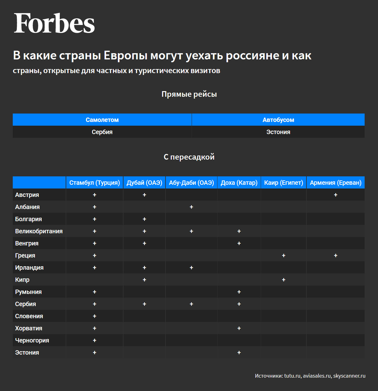 Европа закрыла свое воздушное пространство для российских бортов, но не для самих россиян: они все еще могут попасть в некоторые из европейских стран через аэропорты Турции, ОАЭ, Катара, Египта и других стран. Forbes изучил данные авиакомпаний и агрегаторов цен на авиабилеты и определил, в какие из закрывших небо стран еще остается возможность попасть по туристической визе и каким маршрутом. (читать дальше)