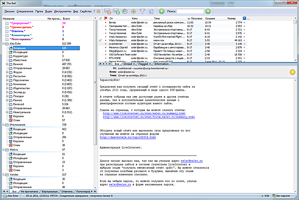 Лично мне в GMail всегда дико не хватало возможности просматривать письма при скольжении по списку заголовков. В хороших почтовых клиентах (The Bat!, Outlook) такая возможность есть по определению - вот, например, так у меня выглядит окно The Bat!. Новые поступившие письма я просматриваю почти мгновенно - курсор идет по списку, снизу разворачивается письмо. Если нужно посмотреть подробности или ответить - это делается одним щелчком.