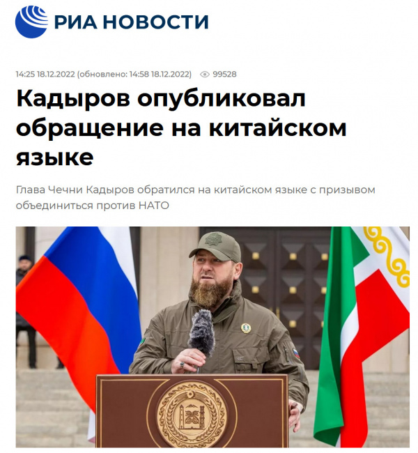 После эпохального обращения Кадырова на китайском языке к мусульманам всего мира с призывом защитить традиционные ценности от тлетворного влияния Запада, я с нетерпением ждал заголовков из серии "Китайцы пришли в восторг после обращения Кадырова" или "Это был просто шок - так отреагировали китайцы на обращение Кадырова", однако нашел только это.