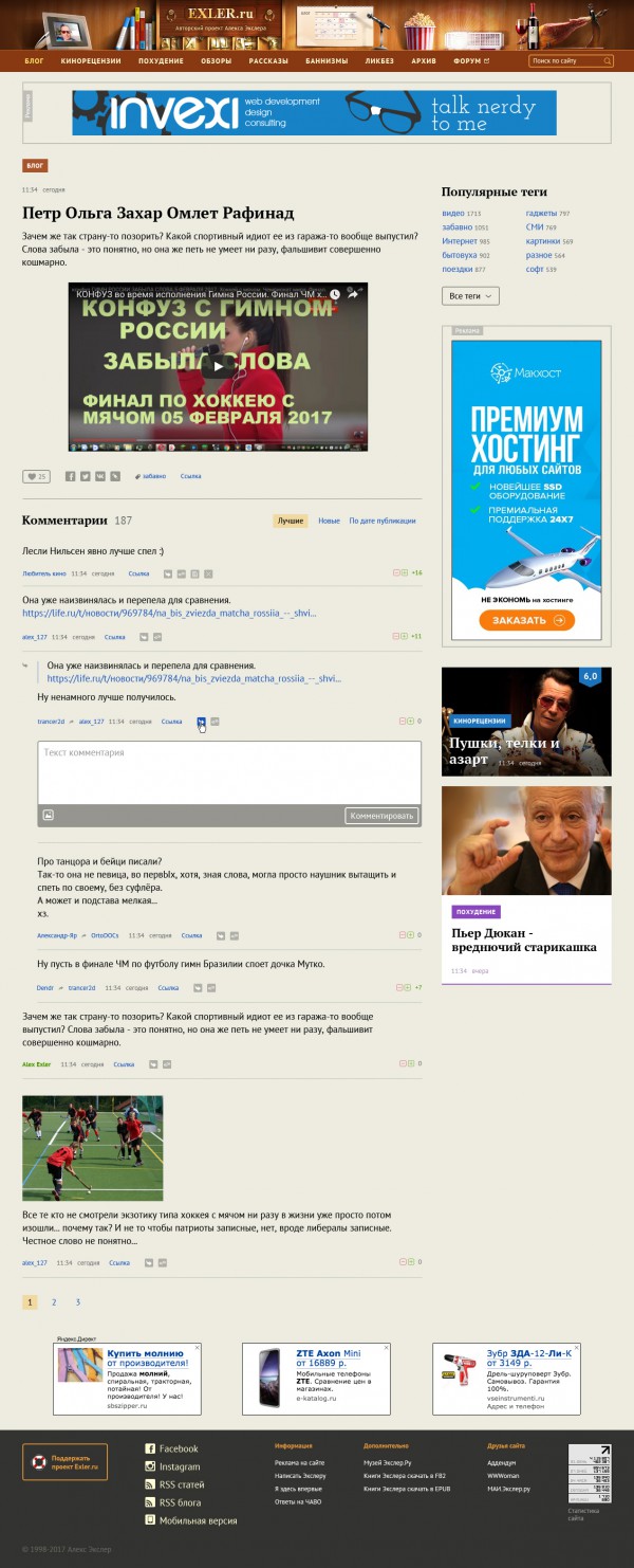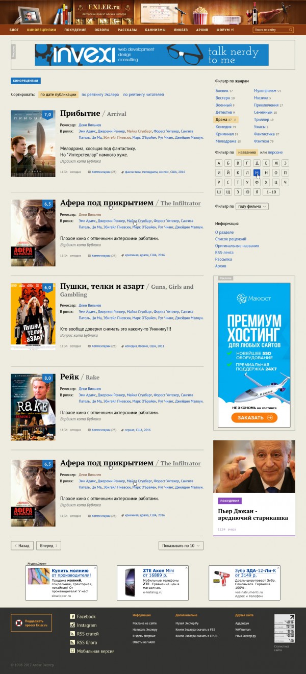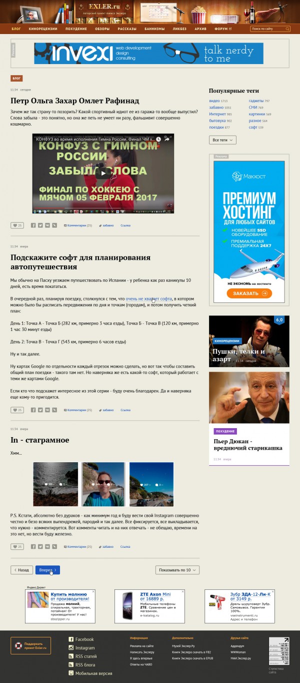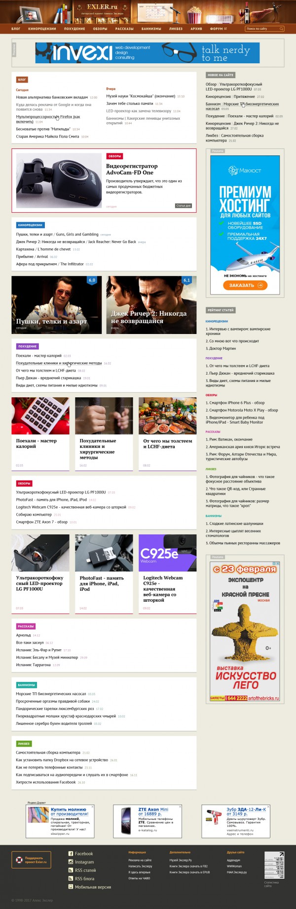 Главная страница. Здесь стояла задача, с одной стороны, сохранить текущую схему навигации, но, с другой стороны, добавить какое-то количество анонсов, чтобы это все выглядело именно как главная страница, а не как просто оглавление, совершенно не привлекающее внимание человека, который понятия не имеет, что такое Exler.ru.