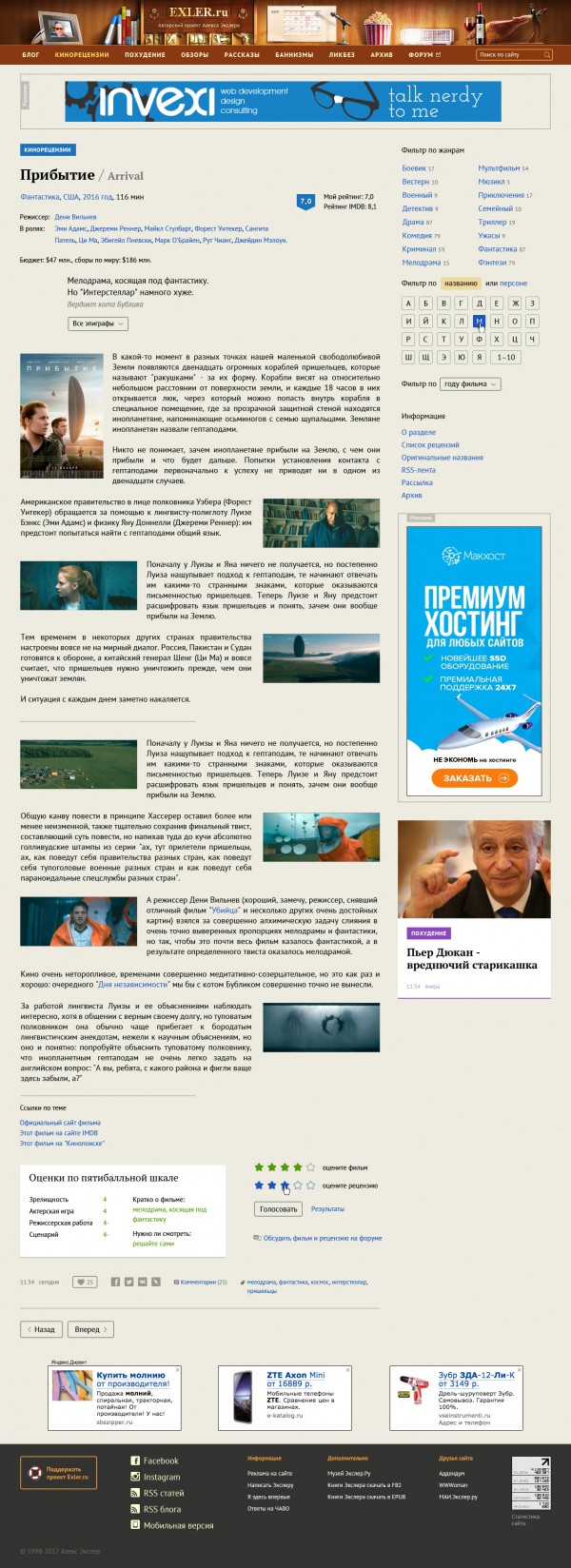 В результата старая схема навигации осталась, а к ней добавились: большой анонс статьи дня (у меня ежедневно выходит по большой статье), два анонса кинорецензий в своем формате и два блока по три анонса других, постоянно пополняемых статейных рубрик (они могут меняться).