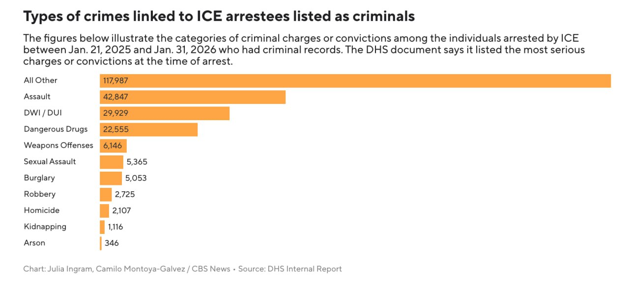 "Меньше 14% из почти 393 тыс. задержанных ICE за этот год имели обвинения или судимости за насильственные преступления" -звучит как бы немного