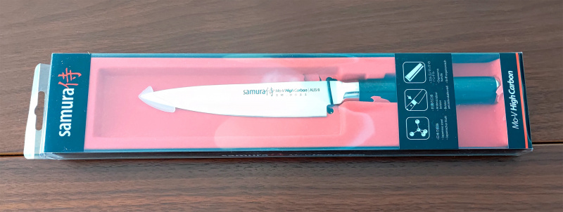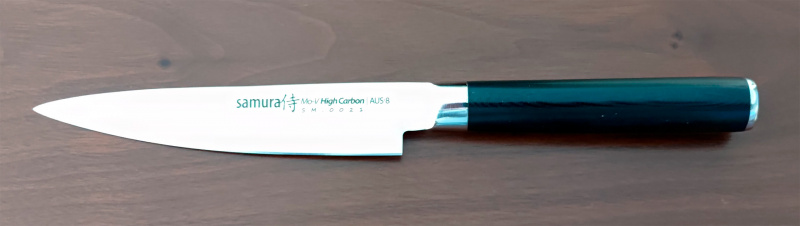 Ну а так как у меня самый любимый в хозяйстве нож - это сантоку Samura Harakiri с лезвием 175 мм, то я и решил взять себе Samura соответствующего типа. Поизучал ассортимент, остановился на варианте Samura Mo-V High Carbon с лезвием 125 мм.
