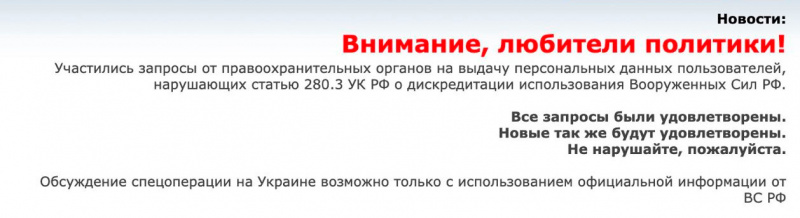 В России вообще можно обсуждать текущую ситуацию только словами пропагандонов, других вариантов уже нет. Мне прислали объявление на форуме одного из российских городов. Все четко и понятно - или говоришь словами соловьиного дерьма, или уголовочка. И не забывайте, что "Нет войне" - это дискредитация использования Вооруженных Сил РФ. Главное - это не забывать!