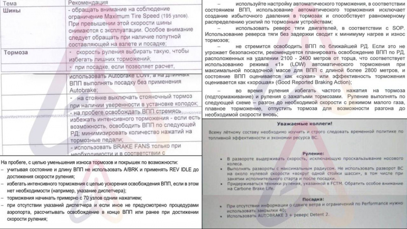 «Уральские авиалинии» посоветовали пилотам выполнять посадку без применения Autobrake только на длинных ВПП, минимизировать число нажатий на тормозные педали, избегать интенсивного торможения, а на стоянке выключать стояночный тормоз, убедившись в установке колодок.
