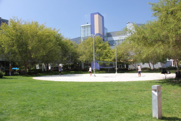 Волейбольная площадка в центре кампуса. Играть там можно когда угодно, но предварительно надо записаться, а то очередь очень большая.