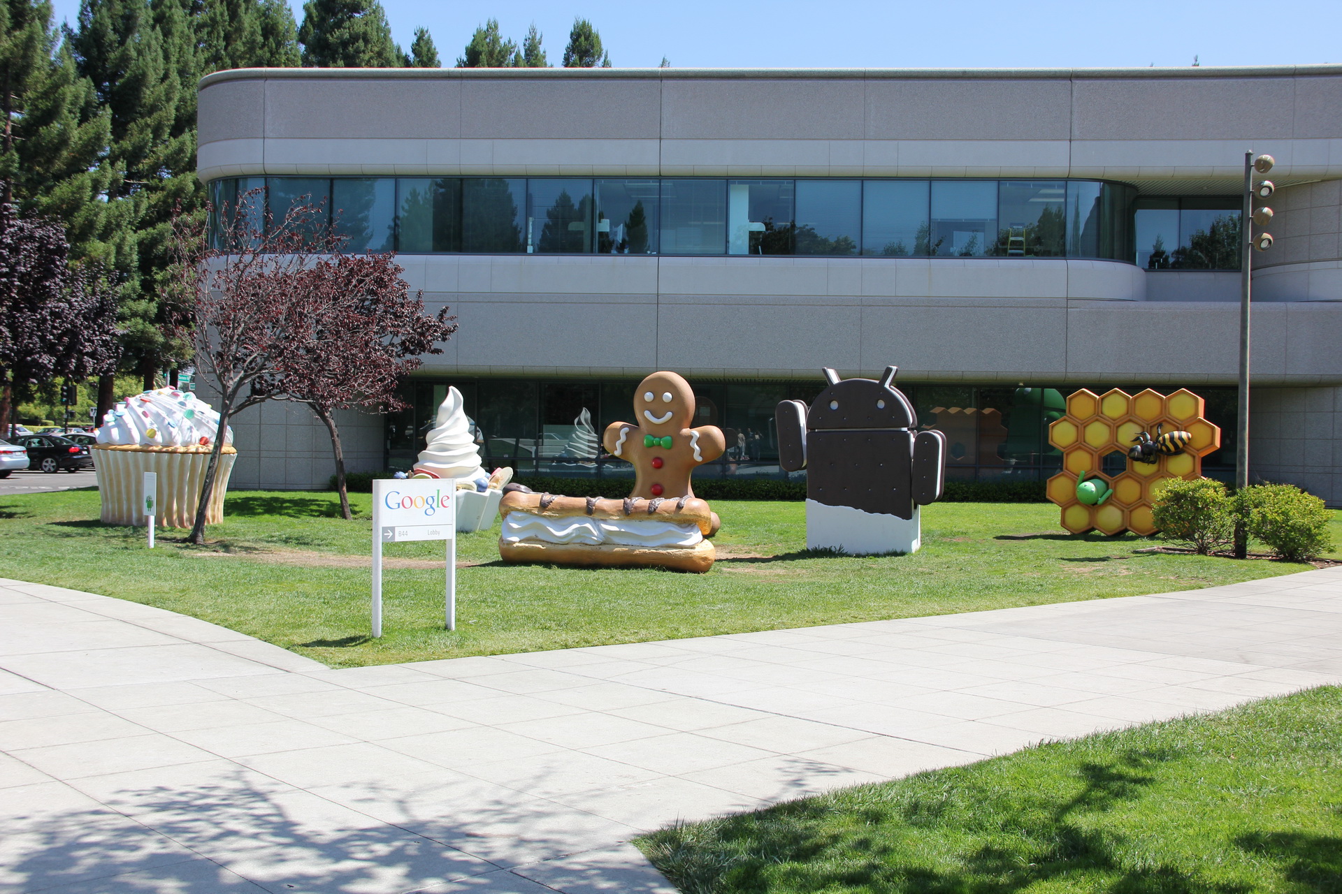 Дошли до офиса, перед которым представлены все версии Android. Приятно, что одну из версий назвали Эклер - вон он, на переднем плане. Я и не знал.