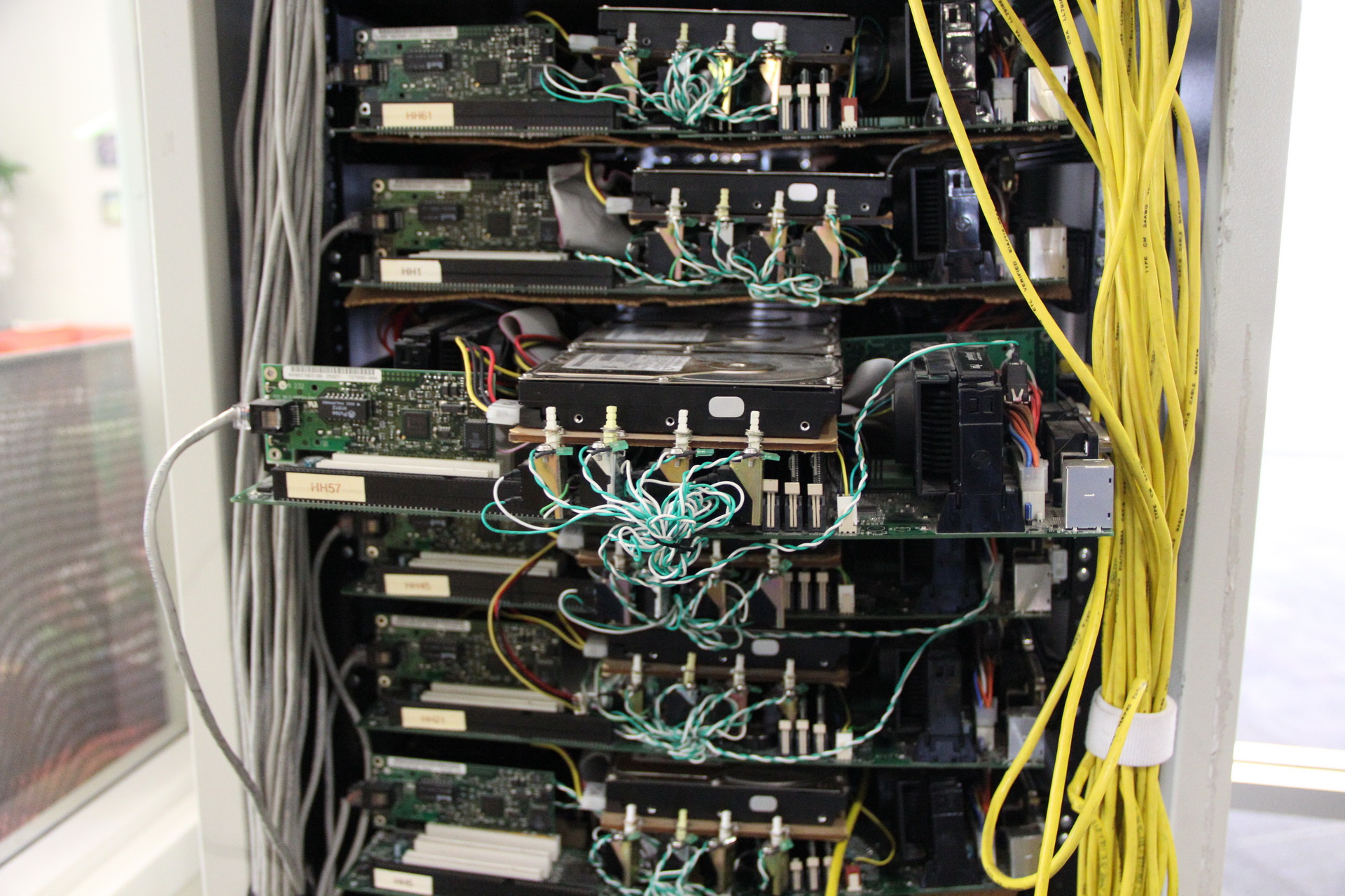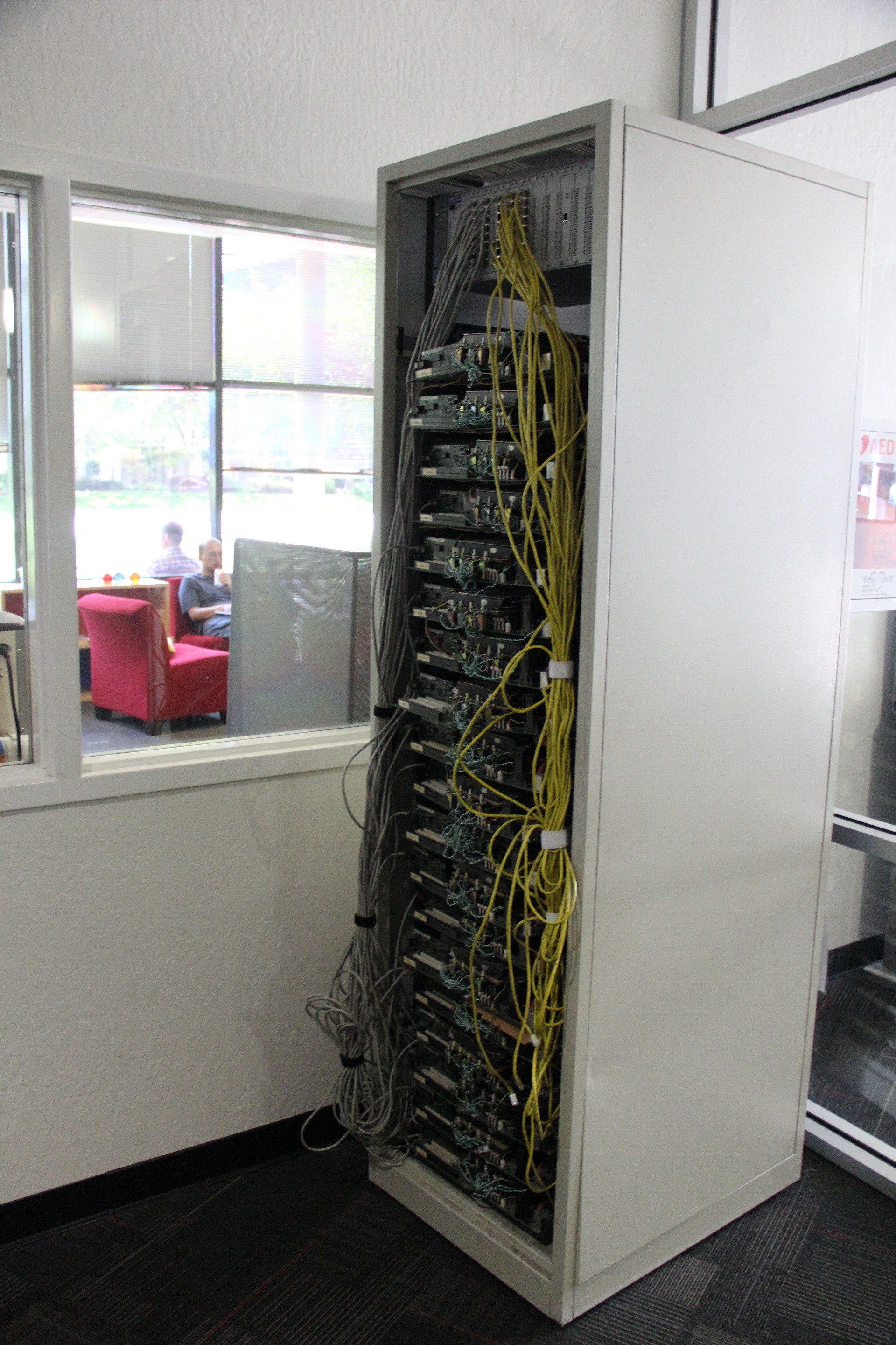 Ну и святая святых - первая серверная стойка Google. Хитрые Пейдж с Брином напихали туда мамаш с дисками без корпусов-юнитов и тем самым в одну стойку ухитрились засунуть в два раза больше железа (оплату-то брали за юнит).