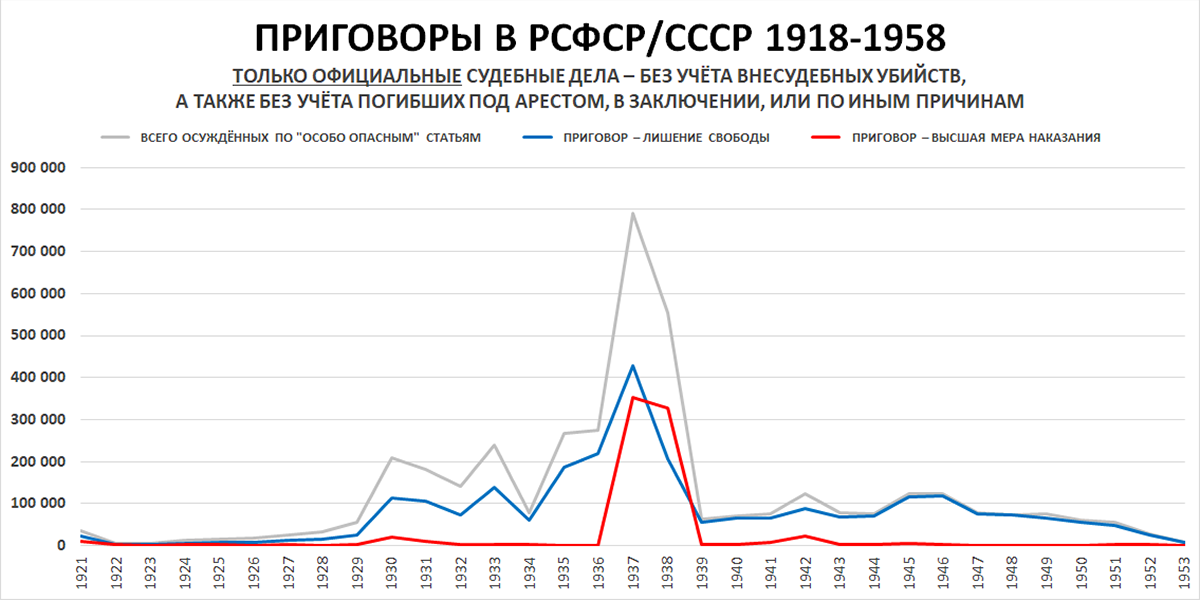 В период Большого Террора – да, именно так. В том же 1937 шансы на ВМН были почти равны, составляя более 80% от шансов на "всего лишь" получение длительного срока. А уже в 1938 – приговоры к ВМН и вовсе на 60% превышали приговоры к лишению свободы. Всё на графике ниже...