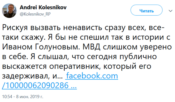 И дальше у них лишь два пути – либо садиться самим (попутно нанеся очередной мощный удар по "чести мундира" и дополнительно "раскачав лодку"), либо давить до последнего и всеми правдами-неправдами сажать Голунова (с привлечением всего пропагандонского админресурса)...