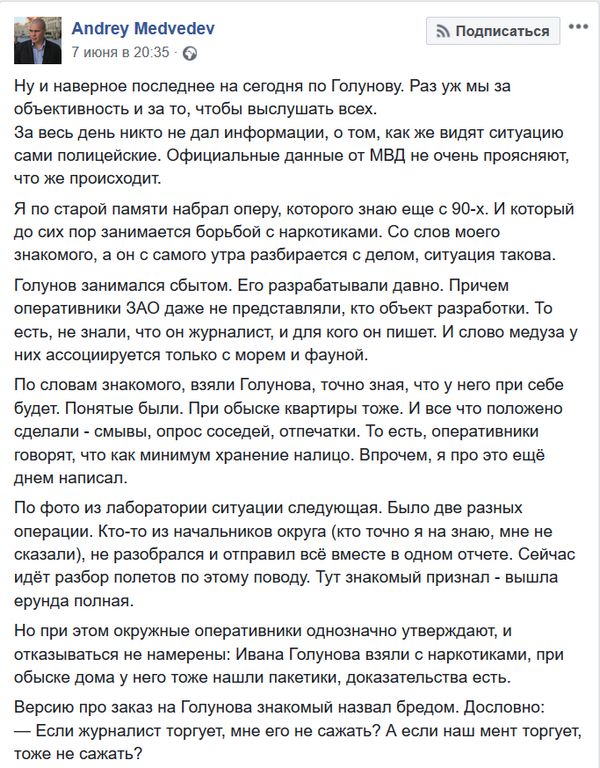 Ну и совершенно прелестный пост некоего Андрея Медведева, журналиста ВГТРК. С удовольствием его публикую, потому что мне аналогичной шняги из серии "Да у меня знакомый полкан МВД, он мне рассказал..." прислали вагон и маленькую тележку, я аж устал ржать по этому поводу. Полканы у них знакомые, опера из девяностых, разработали они...