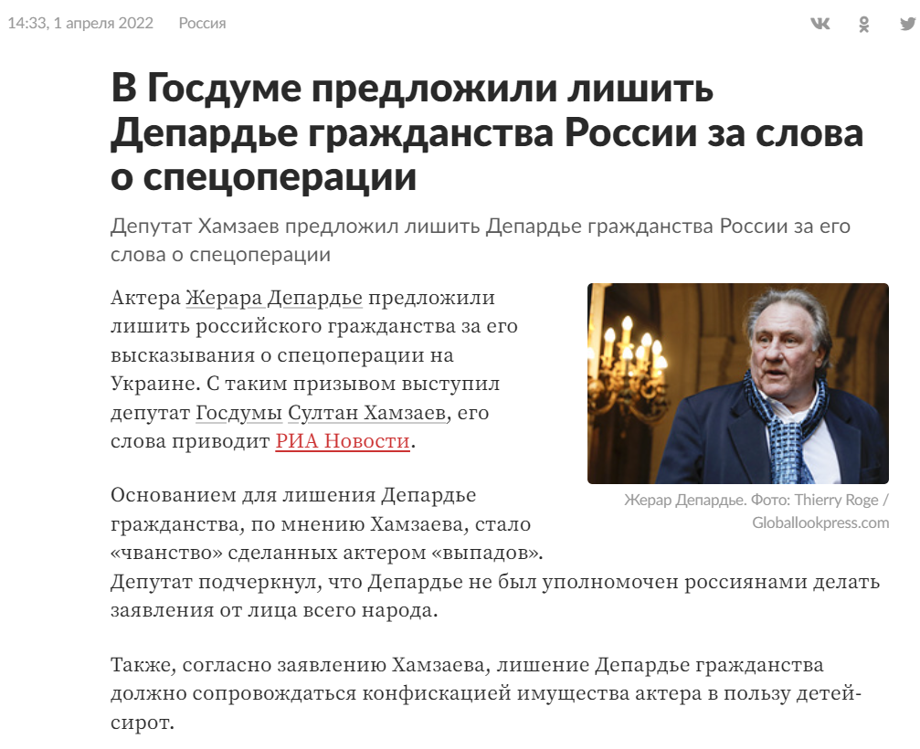 Накануне было распространено заявление Депардье о том, что «россияне не ответственны за безумные, неприемлемые действия таких их лидеров, как Владимир Путин». Ранее Депардье также высказывался за прекращение военных действий в Украине. (Отсюда.)