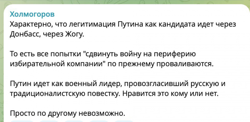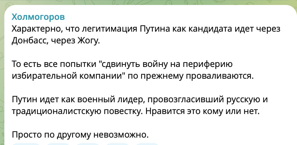 Upd: Пламенный патриот Холмогоров написал страшно верноподданический пост о том, как это славно, что Путин своим выдвижением привлек внимание к лугандонам, но не заметил, что Путин у него выдвинулся через жогу. Холмогоров прав: в путинской России всё делается через жогу.