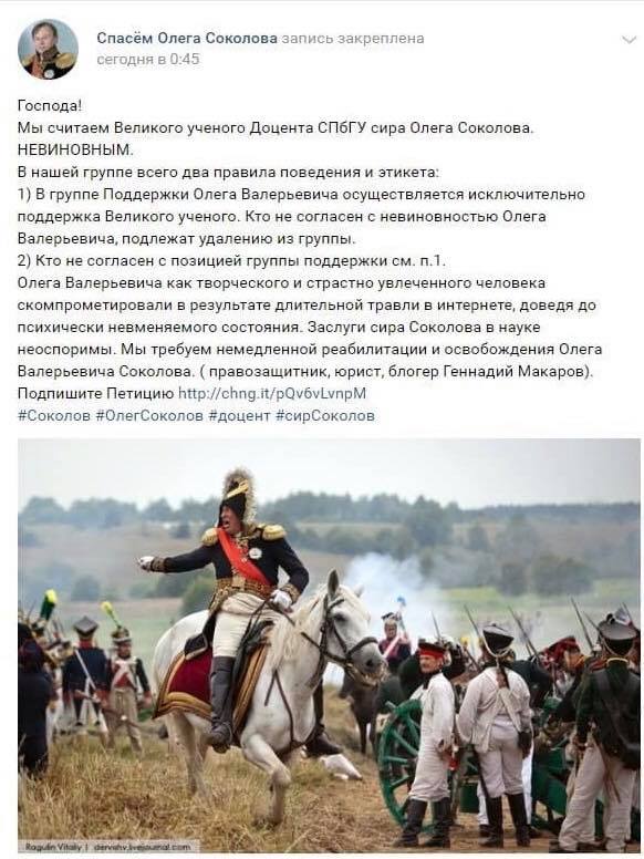 Ну и группу во Вконтактике сделали - Спасти Олега Соколова! Требуют немедленной реалибитации и освобождения.