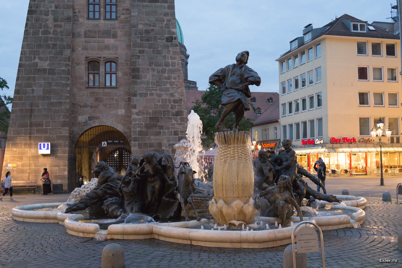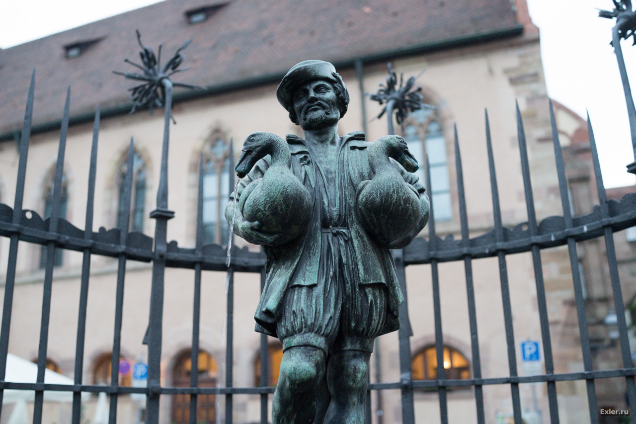 Знаменитый фонтан под названием "Мужик с гусями". С ним связана старая легенда. Жил в одной деревне мужичок, который очень любил выпить пивка. По этой причине он вскорости разорился, поэтому взял подмышку двух последних гусей и пошел в Нюрнберг, чтобы продать гусей и купить пива. Но в дороге гуси вдруг заговорили человеческим немецким голосом: "Не продавай нас, мужичок, а мы тебе напиться дадим". "Хорошо", - ответил мужичок, - "но только чтобы напиться - чистым Barfüßer". Гуси кивнули согласно и вдруг у них из клювов полилась жидкость. Мужик стал было пить эту жидкость, но вдруг остановился и заорал: "Чертовы гуси! Это ж простая вода! Вы что, уморить меня решили?"
