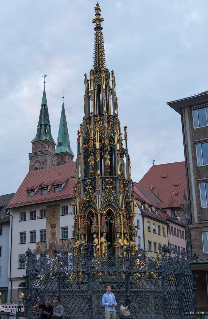 Вот этот красивый фонтан (в Нюрнберге много фонтанов и фонтанчиков) имеет очень оригинальное название в переводе с немецкого - Красивый Фонтан. К ограде этого сооружения приделано якобы золотое (на самом деле латунное) кольцо, которое нужно повернуть три раза и любое желание осуществится. Но гарантий в этом никто не даст. Также гид обязательно покажет вам еще и железное кольцо, которое, дескать, для местных, потому что только оно дает осуществление мечт, а "золотое" - это так, дешевка для туристов.