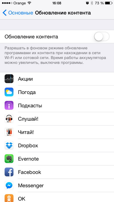 Первым делом я вообще запретил фоновое обновление контента - народ говорил, что эта штука больше всего пожирает аккумулятор. При этом всякие мессенджеры продолжают нормально работать, то есть, например, в WhatsApp сообщения приходят без каких-либо проблем.
