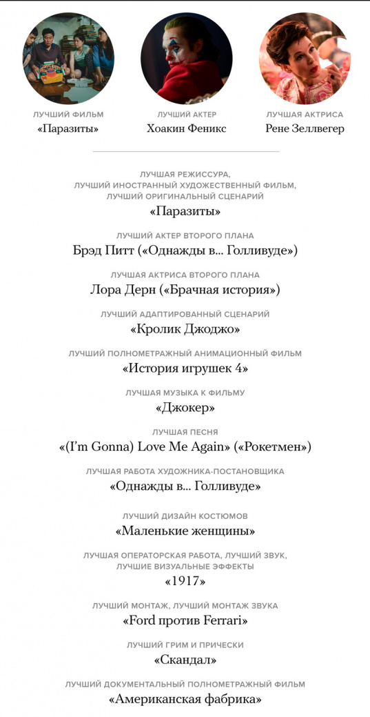 "Паразиты" вполне заслуживали места в тройке. Но - с очевидным отрывом от "Джокера" и "1917".