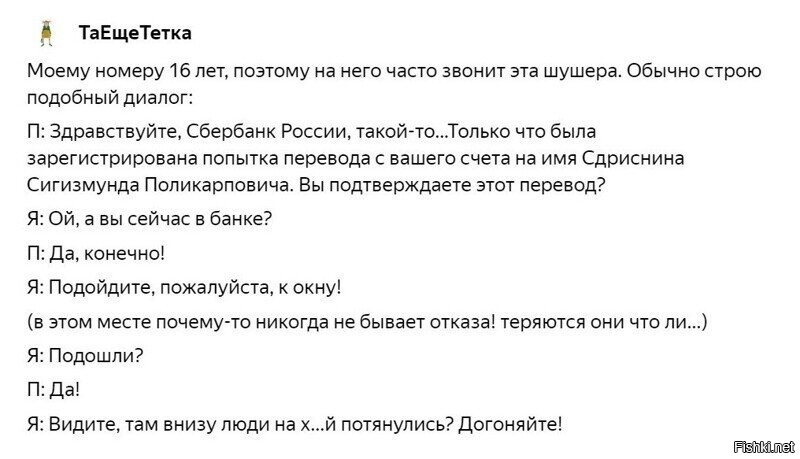 История 2: Звонок во время ковида мне: "Здравствуйте, это собес, вам положена выплата 10 тысяч рублей по вашему заболеванию в связи с пандемией. Можете сообщить данные своего счёта для перевода?". Что-то во дёрнуло, я сказал им погодить. Нашёл в инете телефон собеса, перезвонил туда - они плачут: "это реальная выплата, мы обзваниваем, а нам никто не верит". Дал реквизиты счёта - реально прислали десять тысяч!!