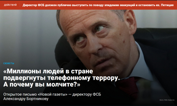 В "Новой газете" опубликовали открытое письмо директору ФСБ Бортникову. Вопросы-то заданы, а вот будут ли на них ответы, а главное - будет ли остановлена эта волна телефонного терроризма - что-то мне подсказывает, что ни ответов, ни эффективных действий мы не дождемся. (Вот петиция на Change.org.)