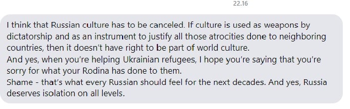 Не надо делать за диктатора его работу. Пусть он сам перекрывает культурные потоки и жители России знают: это Путин их обкрадывает, лишает книг, сериалов, музыки.