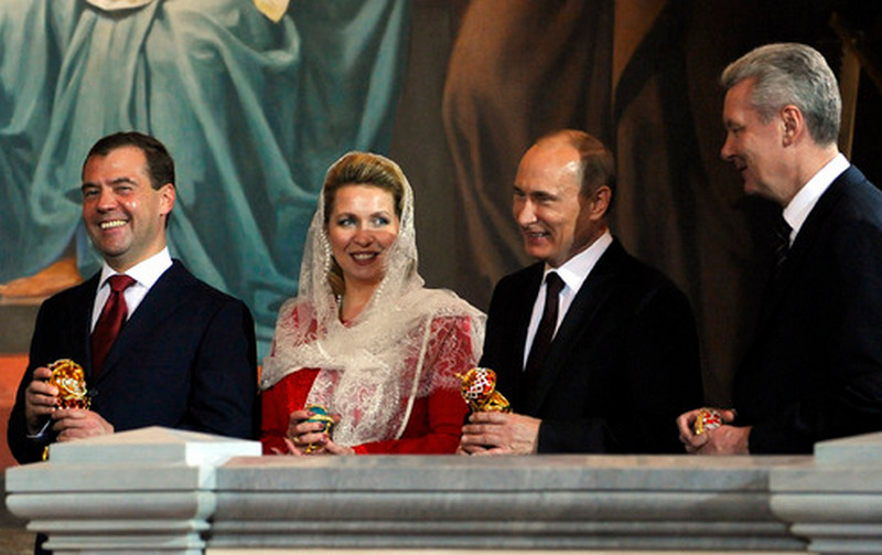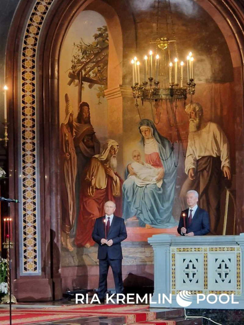 Путин таки посетил пасхальное богослужение в ХХС. С Собяниным. Свечку подержал. Наверное, помолился. (Верхняя фотка корреспондента ТАСС - прям блеск, взял отсюда.)