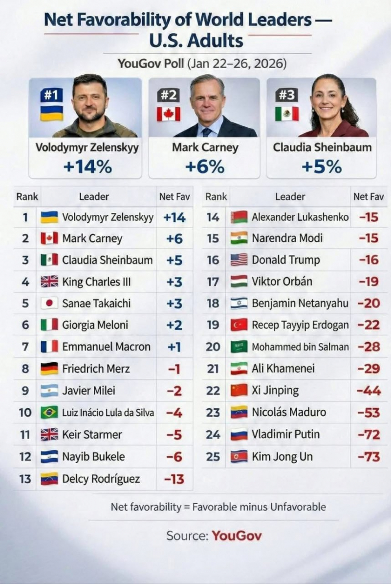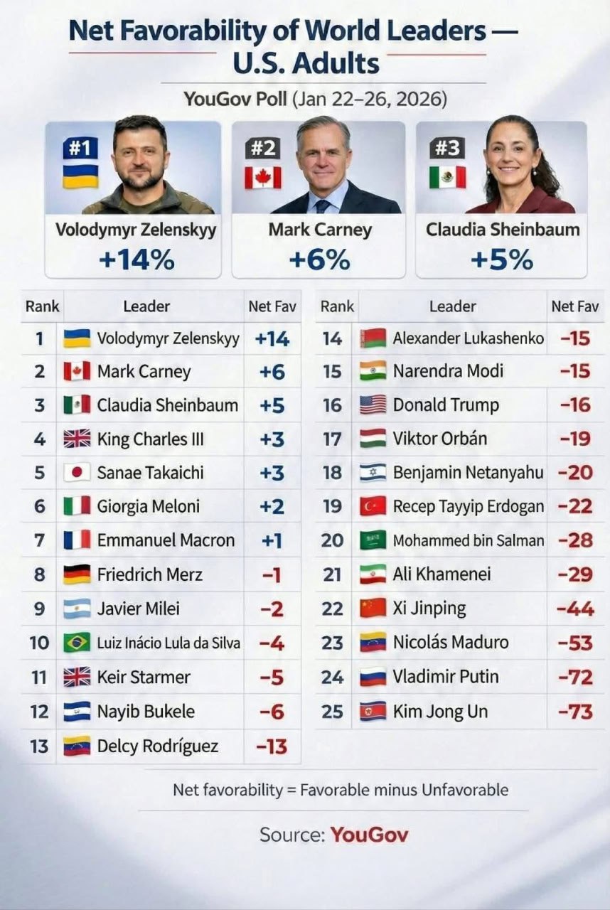 Зеленский самый популярный лидер в Америке. Карни второй. Шейнбаум третья.