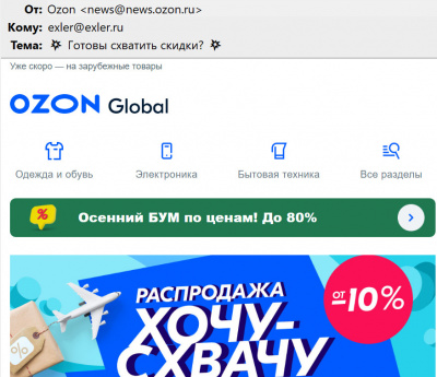 Пятнадцать лет прошли в тишине и спокойствии, как вдруг, начиная с прошлой недели, адрес exler@exler.ru с "Озона" стал спамиться маркетинговыми письмами, вроде вот такого.
