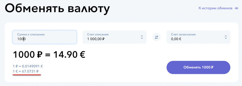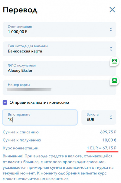 При этом обмен можно и не делать, вы можете заведенные рубли сразу вывести на евровую карту с автоматической конвертацией - там показывается курс и комиссия.