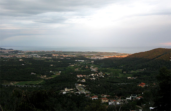 Забавная картинка. У нас тут на гору наползла тучка, идет дождь. А город у моря - я так понимаю, что это Мальграт де Мар - освещен заходящим солнцем.