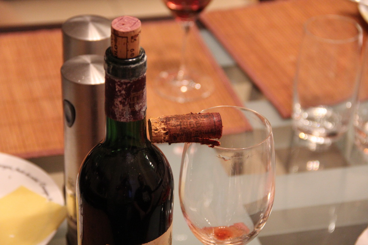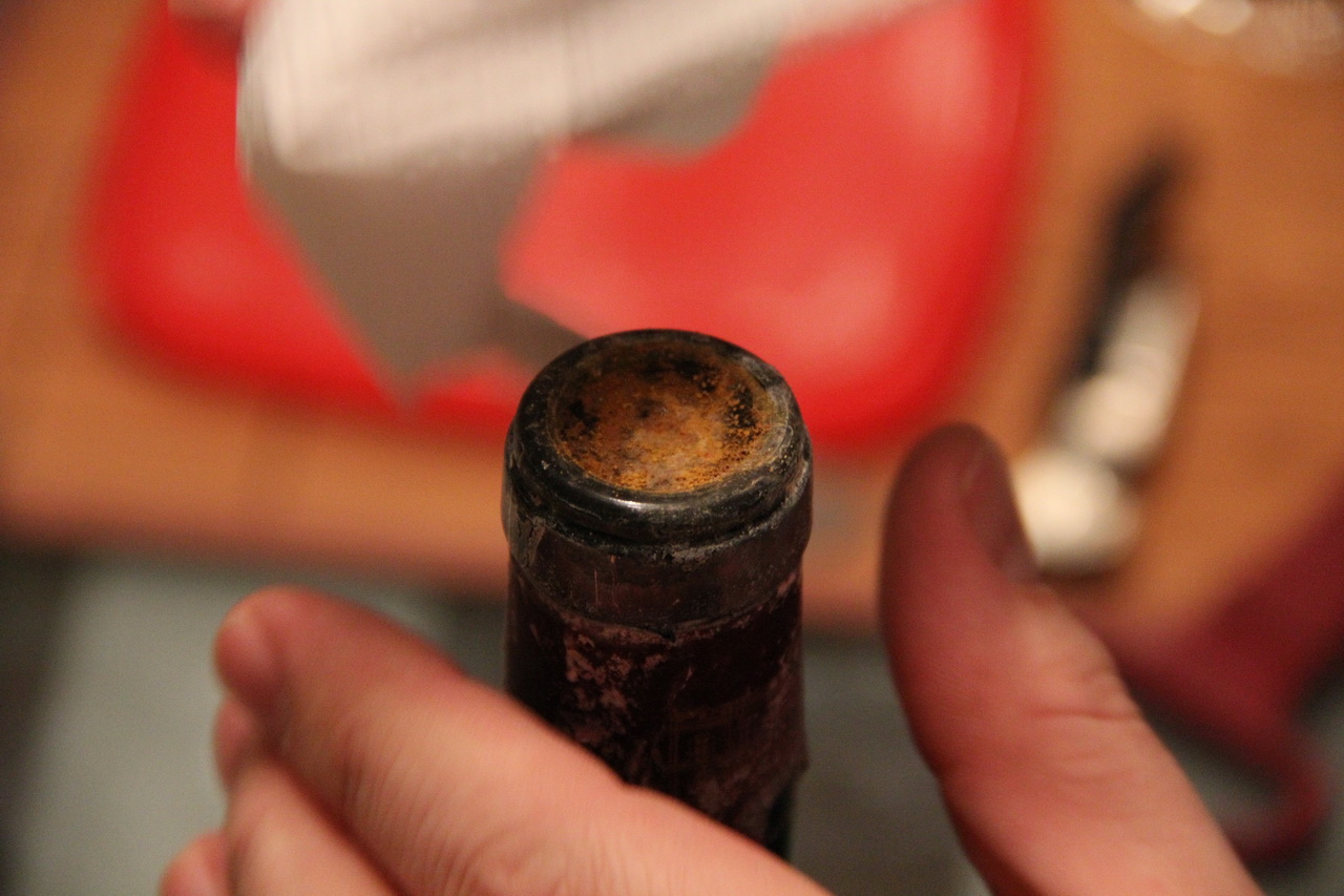 Достали пробку. Денис говорит, что верх пробки хорошо сохранился, запах от пробки - правильный, так что шансы велики.