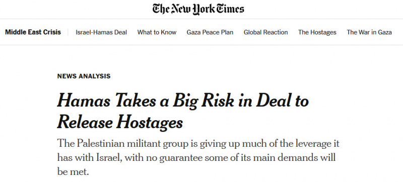 Заголовок: "Хамас берет на себя риск, освобождая заложников. Палестинская милитаризованная группа отдает рычаг давления на Израиль без гарантий, что их требования будут выполнены".