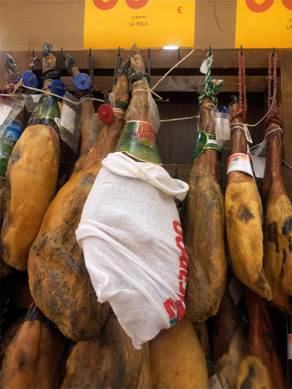 В "Ашане" у них очень удобно сделано: лежат вот такие специальные чулочки, которые натягиваешь на хамон - и тащишь его к кассе, ничего этим хамоном не пачкая. Плюс есть варианты специально для перевозки, когда хамон упакован в плотную картонную коробку и снабжен специальными ленточками для удобной переноски.