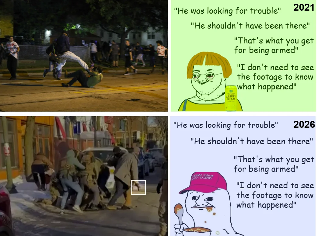 "Очевидцы, местные чиновники и семья жертвы оспорили эту версию, указав, что в руке у Претти был телефон, а не оружие.Также согласно анализу видео инцидента, проведенного CNN, один из сотрудников федеральной иммиграционной службы забирает у Претти пистолет еще до того, как начинается стрельба."Ну, то есть пистолет у него все таки был? Смотрим видео. Идёт какая-то заваруха. Нормальный человек с пистолетом за поясом попрется в самую кучу, где полно силовиков, о которых известно, что они в массе явные неадекваты? Знаете, на что похоже? Это как зевака на пляже, увидев плавник в море, бросился в воду с целью сделать селфи с белой акулой. И кто виноват, что его схарчили в итоге?